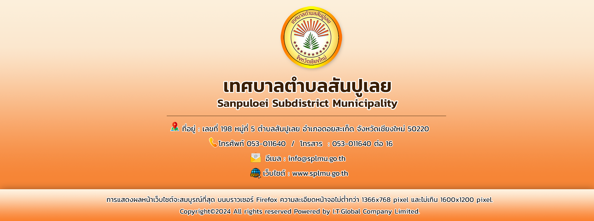 ยินดีต้อนรับเข้าสู่เทศบาลตำบลสันปูเลย ติดต่อสอบถาม : โทรศัพท์ 053-011640 โทรสาร 053-011640 ต่อ 116 เบอร์โทรสายด่วน 053-011641 062-3100136 งานป้องกันและบรรเทาสาธารณภัย (24ชั่วโมง)
